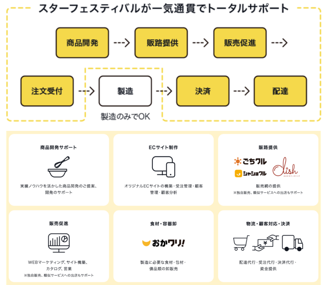また、スターフェスティバルが運営する企業・ワーカー向けデリバリーサービス「ごちクル」・「シャショクル」のみならず、独自販売や類似サービスへの出店も含めた中食事業そのものへの参入をサポートします。
